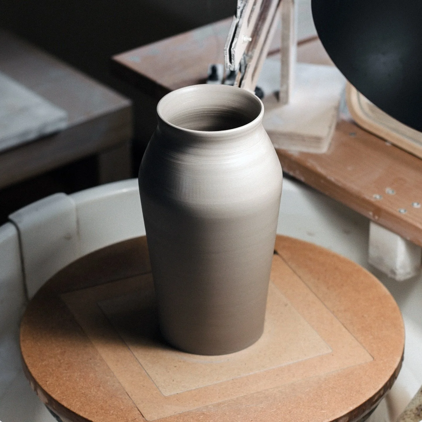 View fullsize I’ve been working through a batch of pots for an order for @clan.clare, and one of the forms on the list is this stem vase. Fresh off the wheel, it stands around 21cm tall before any firings. The lower section will be tapered further when trimm