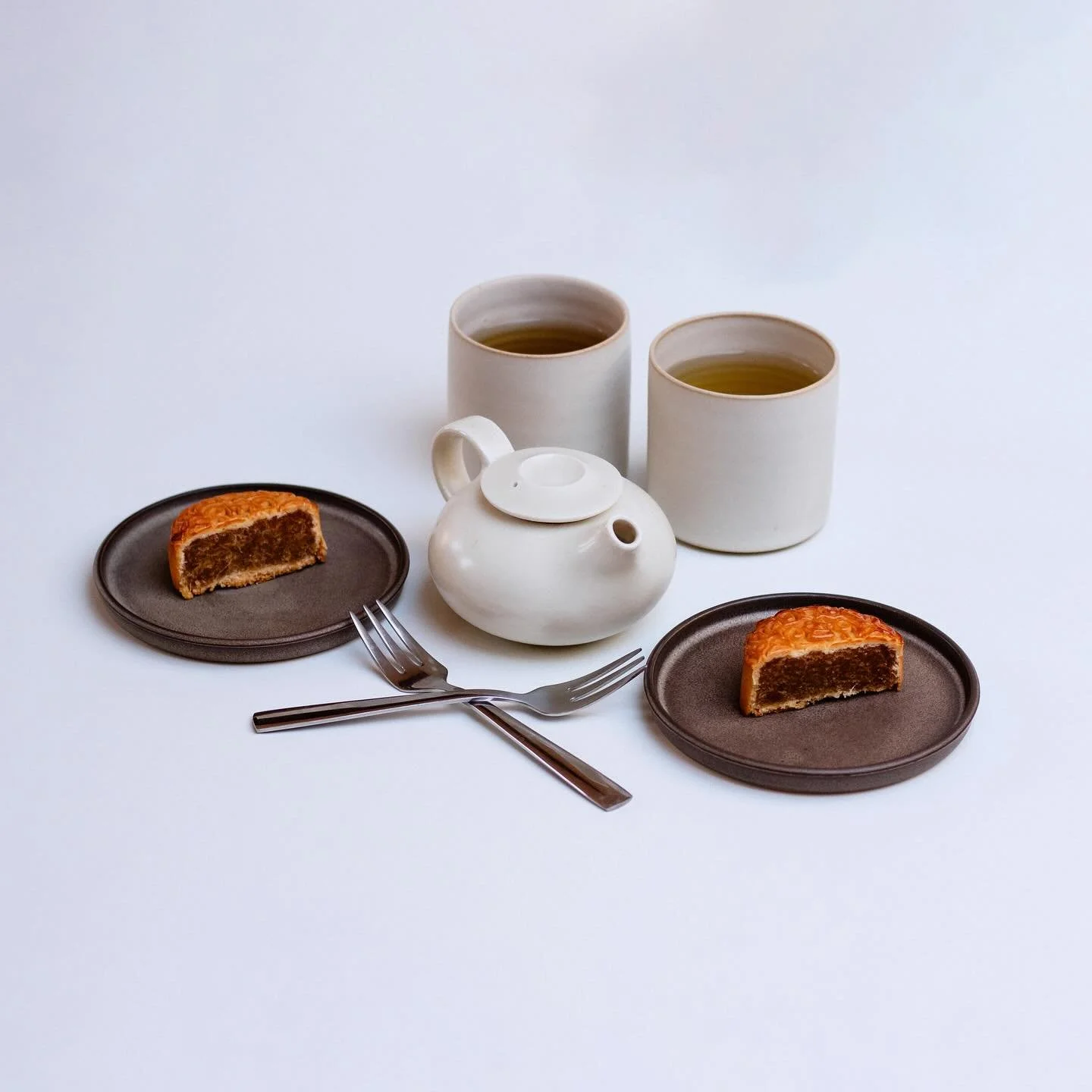 View fullsize Green tea mooncake, two umber brown biscuit plates, and Yunnan tea poured from a charming teapot made by @lucyhughes32.